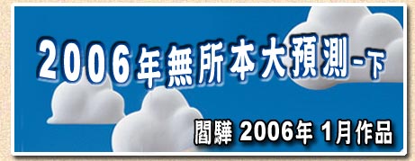 本預測報告是閻驊電子報連載七年來,每雙數年年初的固定傳統戲碼。過去三次預測,成功率均達七、八成之譜。不過2006年為詭譎多變的低調年,故本單元預估成功率頂多四成左右。