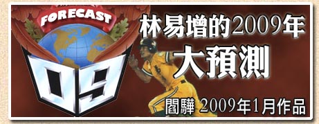 林易增的名字諧音是「靈異增」,這代表在2009年「『靈異』現象會與日俱『增』」,2008年已經是讓全世界預測專家瘋狂大槓龜的一年,2009年可能會更嚴重!不過2008年不按牌理出牌的趨勢演變,已經讓所有人漸漸習慣各式各樣的「震撼教育」,養成更為「謙卑」的人生態度。所以2009年儘管風雨飄搖,每一季都會出現一個空前大震撼,但是您絕對不會像2008年那麼地手足無措! |